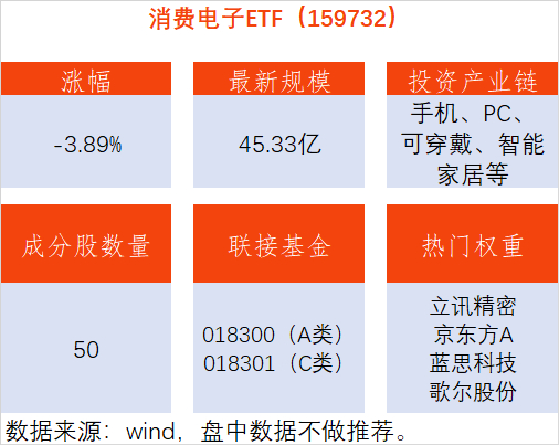 消费电子ETF(159732)跟踪国证消费电子指数,主要投资于业务涉及消费电子产业的50家A股上市公司,行业主要分布于电子制造、半导体、光学光电子等市场关注度较高的主流板块。其场外联接基金为,A类:018300;C类:018301。