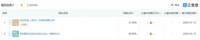 股权结构显示,该公司由时空存储(深圳)半导体有限公司(持股51%)、深圳鹏芯共创科技合伙企业(有限合伙)共同出资设立。其中,时空存储(深圳)半导体有限公司系2025年12月刚成立的全资子公司,由时空科技100%控股。