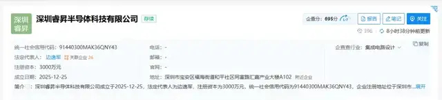 企查查APP信息显示,2026年1月,深圳市时空存储技术有限公司在深圳市南山区成立,注册资本5000万元,法定代表人为陈念。公司经营范围涵盖半导体分立器件制造与销售、集成电路制造、集成电路芯片设计及相关服务等。