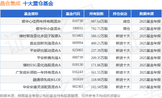根据2025基金年报公募基金重仓股数据,重仓该股的公募基金共40家,其中持有数量最多的公募基金为银华基金的银华心佳两年持有期混合。银华心佳两年持有期混合目前规模为63.54亿元,最新净值1.1164(1月30日),较上一交易日下跌1.08%,近一年上涨79.63%。该公募基金现任基金经理为李晓星 张腾 杜宇。张腾在任的基金产品包括:银华瑞和灵活配置混合A,管理时间为2024年3月7日至今,期间收益率为87.46%;银华甄选价值成长混合A,管理时间为2024年8月7日至今,期间收益率为62.2%;银华甄选价值回报混合A,管理时间为2025年9月18日至今,期间收益率为9.72%。李晓星在任的基金产品包括:银华中小盘混合,管理时间为2015年7月7日至今,期间收益率为315.49%;银华盛世精选灵活配置混合发起式A,管理时间为2016年12月22日至今,期间收益率为124.21%;银华心诚灵活配置混合A,管理时间为2018年3月12日至今,期间收益率为86.24%;银华心怡灵活配置混合A,管理时间为2018年7月5日至今,期间收益率为237.74%。杜宇在任的基金产品包括:银华中小盘混合,管理时间为2019年12月11日至今,期间收益率为119.64%;银华丰享一年持有期混合,管理时间为2022年1月26日至今,期间收益率为27.74%;银华心质混合A,管理时间为2023年3月30日至今,期间收益率为53.01%;