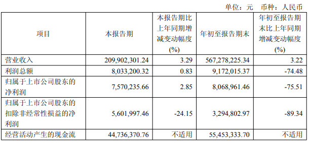 2025年前三季度,井松智能营业收入5.67亿元,同比增长3.22%;归属于上市公司股东的净利润806.90万元,同比减少75.51%;归属于上市公司股东的扣除非经常性损益的净利润329.48万元,同比减少89.34%;经营活动产生的现金流量净额5545.33万元。
