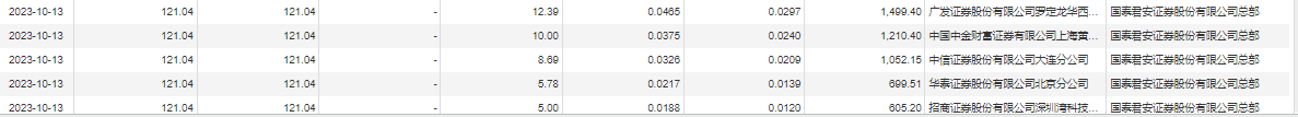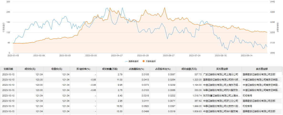 10月13日,寒武纪-U今日大宗交易成交116.08万股,成交额1.4亿元,占当日总成交额的12.29%,成交均价120.91元,较市场收盘价折价0.11%,其中最高成交价123.9元,最低成交价120元。