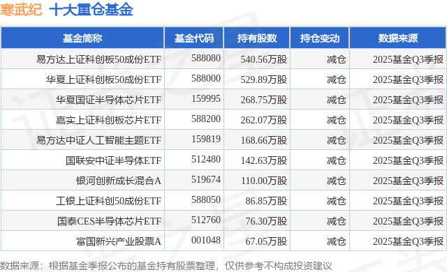 重仓寒武纪的前十大公募基金请见下表: