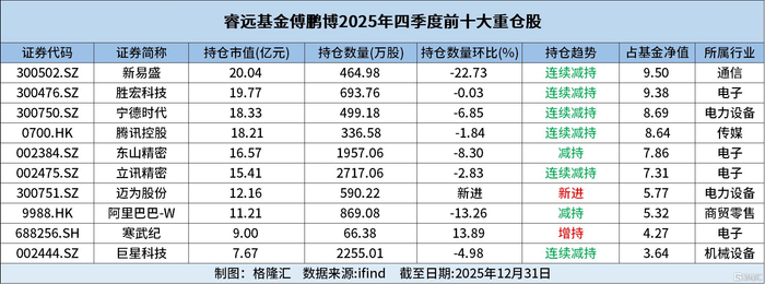 2025年四季度,傅鹏博旗下基金前十大重仓股中,迈为股份代替中国移动新进入其前十大重仓股;增持寒武纪;减持新易盛、胜宏科技、宁德时代、腾讯控股、东山精密、立讯精密、阿里巴巴-W、巨星科技。