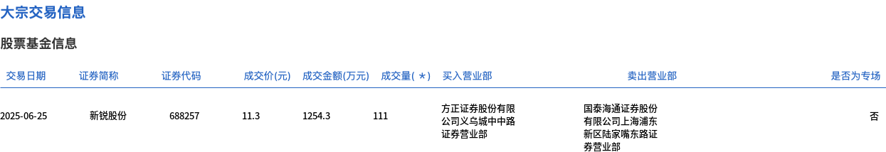 新锐股份今日大宗交易折价成交111万股,成交额1254.3万元