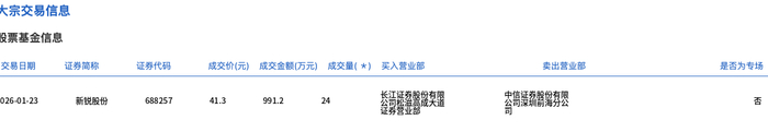 1月23日,新锐股份大宗交易成交24万股,成交额991.2万元,占当日总成交额的2.78%,成交价41.3元,较市场收盘价53.19元折价22.35%。