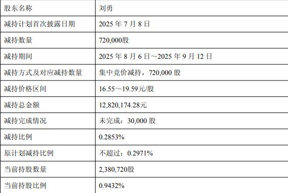 公司2025年10月11日披露《高级管理人员提前终止减持计划暨减持结果公告》,2025年7月8日,公司披露了《新锐股份关于高级管理人员减持股份计划的公告》。因个人资金需求,刘勇计划自2025年7月30日至2025年10月29日,以集中竞价的方式减持公司股份,数量不超过750,000股,不超过公司总股本比例的0.2971%。公司于2025年10月10日收到刘勇出具的告知函,刘勇2025 年8月6日至2025年9月12日通过集中竞价减持720,000股,占公司总股本比例0.2853 %,减持价格区间16.55~19.59元/股,减持总金额12,820,174.28元,截至公告披露日,刘勇综合考虑决定提前终止减持计划,剩余30,000股不再减持。年报显示,刘勇为副总裁。