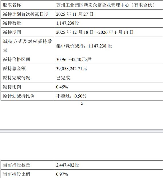 公司1月16日披露关于股东提前终止减持计划暨减持股份结果的公告,公司股东苏州工业园区新宏众富企业管理中心(有限合伙)(简称“新宏众富”)系公司员工持股平台,持有公司3,594,640股,占公司总股本的1.42%,为公司控股股东、实际控制人、董事、总裁吴何洪的一致行动人,2025年11月27日,公司披露了《苏州新锐合金工具股份有限公司股东减持股份计划公告》,新宏众富拟在2025年12月18日至2026年3月17日期间,通过集中竞价、大宗交易等方式减持公司股份,减持数量不超过1,262,238股,即不超过公司目前总股本的0.50%。公司于2026年1月15日收到新宏众富出具的告知函,截至公告披露日,新宏众富已通过集中竞价交易方式减持公司股份1,147,238股,占公司总股本的0.45%,减持计划已实施完毕,本次减持计划提前终止。新宏众富资于2025年12月18日至2026年1月14日通过集中竞价方式减持数量1,147,238股,持价格区间30.96至42.40元/股,减持总金额39,058,242.71元。