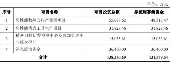 本次向特定对象发行股票募集资金总额不超过131,579.54万元(含本数),扣除发行费用后的净额拟投资于高性能数控刀片产业园项目、高性能凿岩工具生产项目、精密刀具研发检测中心及总部管理中心建设项目、补充流动资金。
