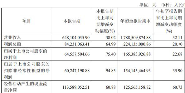 年初至报告期末,公司实现营业收入17.89亿元,同比增长32.11%;归属于上市公司股东的净利润1.65亿元,同比增长22.68%;归属于上市公司股东的扣除非经常性损益的净利润为1.54亿元,同比增长35.90%;经营活动产生的现金流量净额-1.26亿元。