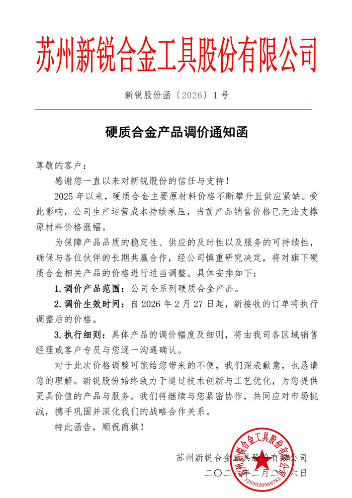 2月26日,新锐股份发布硬质合金产品调价通知函。公司表示,2025年以来,硬质合金主要原材料价格不断攀升且供应紧缺。受此影响,公司生产运营成本持续承压,当前产品销售价格已无法支撑原材料价格涨幅。自2月27日起,新接收的订单将执行调整后的价格。