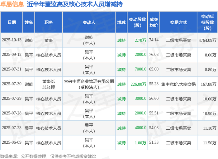 卓易信息近半年内的董监高及核心技术人员增减持详情如下:
