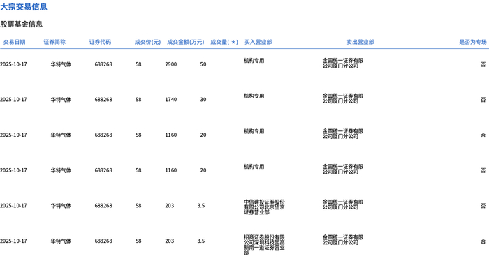 10月17日,华特气体大宗交易成交127万股,成交额7366万元,占当日总成交额的23.16%,成交价58元,较市场收盘价62.98元折价7.91%。