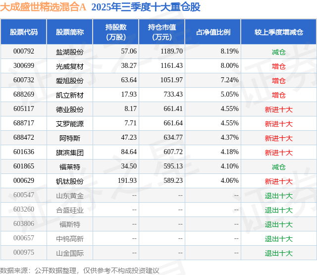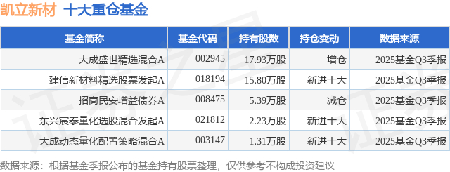 根据2025基金Q3季报公募基金重仓股数据,重仓该股的公募基金共5家,其中持有数量最多的公募基金为大成基金的大成盛世精选混合A。大成盛世精选混合A目前规模为1.06亿元,最新净值2.528(11月6日),较上一交易日上涨0.64%,近一年上涨21.89%。该公募基金现任基金经理为赵蓬。赵蓬在任的基金产品包括:大成蓝筹稳健混合A,管理时间为2023年8月4日至今,期间收益率为15.15%;