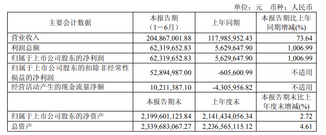 臻镭科技2025年半年度报告显示,2025年上半年,公司实现营业收入2.05亿元,同比增长73.64%;归属于上市公司股东的净利润6231.97万元,同比增长1006.99%;归属于上市公司股东的扣除非经常性损益的净利润5289.50万元,去年同期为-60.56万元;经营活动产生的现金流量净额为1021.14万元。