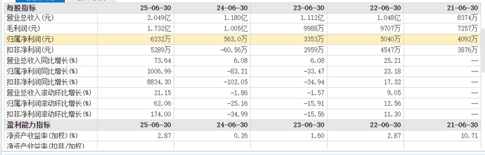 财报显示,臻镭科技净利润在2023年和2024年两年经历了大幅下滑,今年上半年完成高增长。公司2025年上半年实现营业收入2.05亿元,同比增长73.64%;归母净利润6231.97万元,同比增长1006.99%。