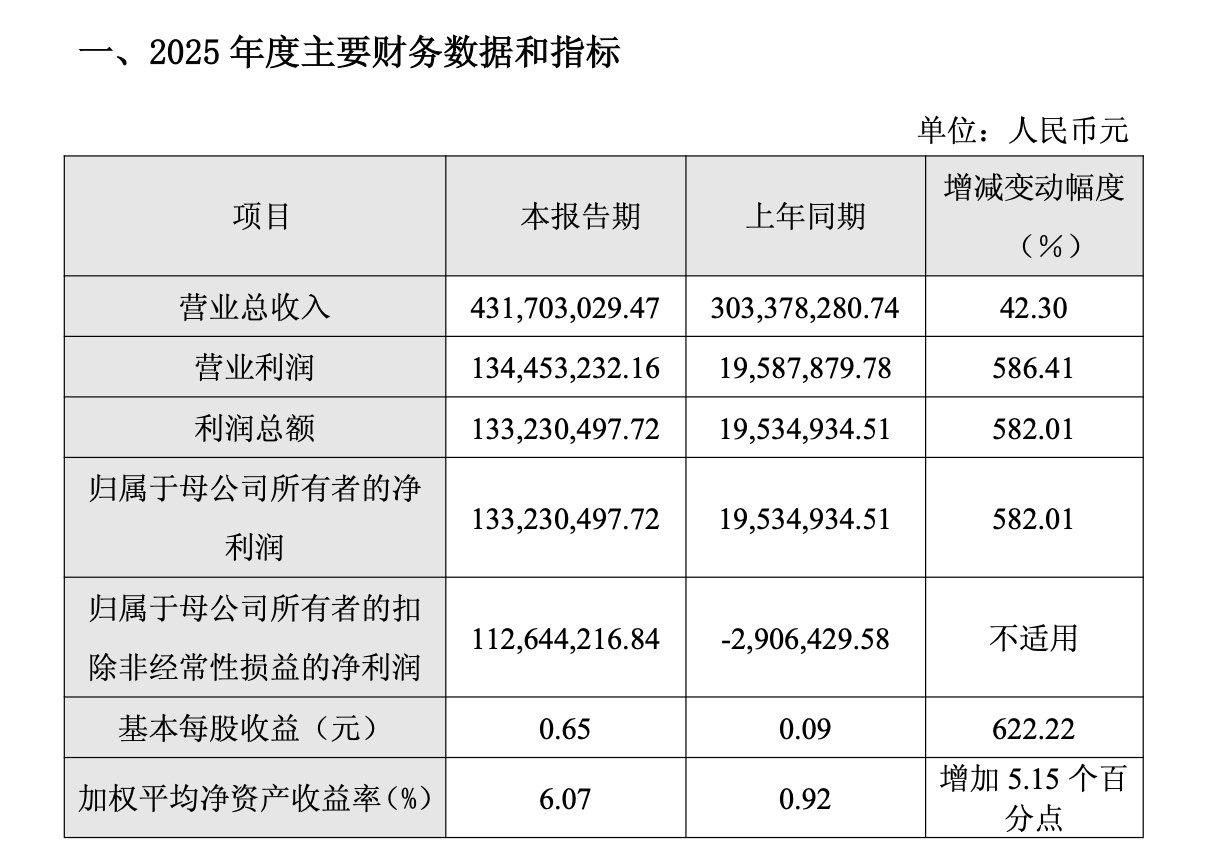 经其初步核算,该公司2025年度实现营业收入4.32亿元,较上年同期增长42.30%;实现归属于母公司所有者的净利润1.33亿元,同比增长582.01%;实现归属于母公司所有者的扣除非经常性损益的净利润1.13亿元,上年同期为-0.03亿元。