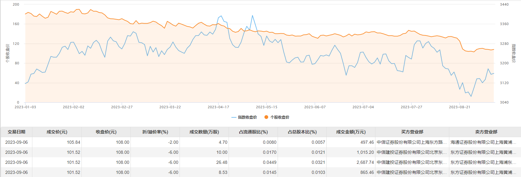 今日大宗交易成交49.71万股,成交额5065.86万元,占当日总成交额的12.38%,成交均价101.91元,较市场收盘价108元折价5.64%,其中最高成交价105.84元,最低成交价101.52元。