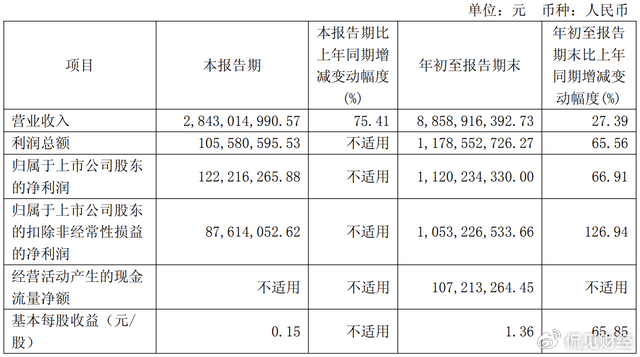 其次,从三季度财报来看,今年前三季度公司实现营收88.59亿元,同比增长27.39%;净利润为11.20亿元,同比增长66.91%;扣非净利润为10.53亿元,同比增长126.94%。