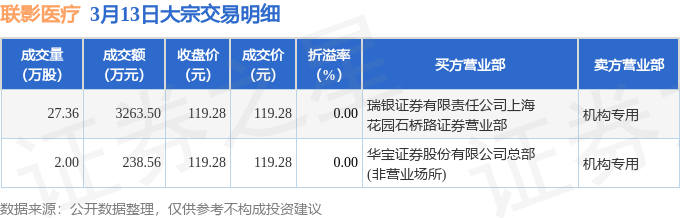 证券之星消息,3月13日联影医疗发生大宗交易,交易数据如下: