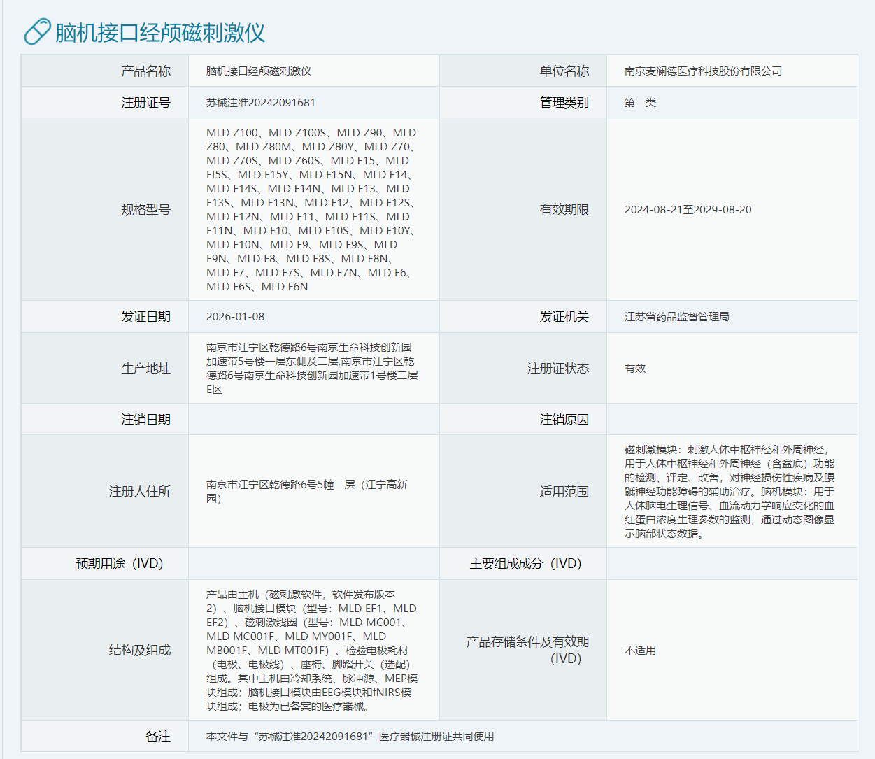 1月9日消息,据江苏省药品监督管理局官网显示,麦澜德(688273.SH)脑机接口经颅磁刺激仪取得医疗器械注册证。