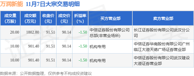 11月7日万润新能现3笔大宗交易 机构净买入1802.8万元