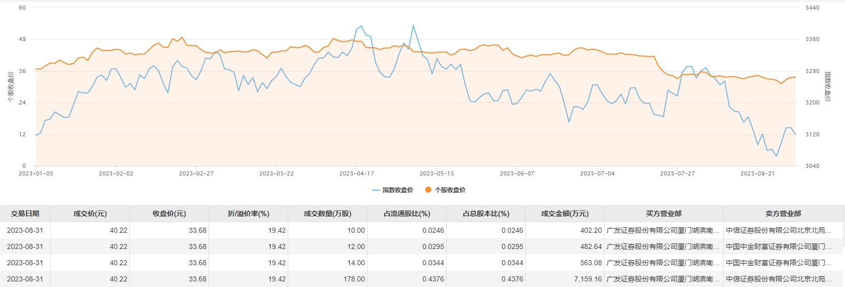 今日大宗交易成交214万股,成交额8607.08万元,占当日总成交额的67.77%,成交价40.22元,较市场收盘价溢价19.42%。