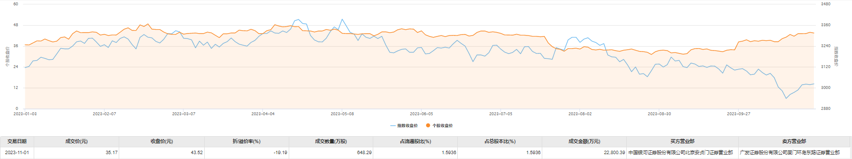 今日大宗交易成交648.29万股,成交额2.28亿元,占当日总成交额的71.38%,成交价35.17元,较市场收盘价折价19.19%。