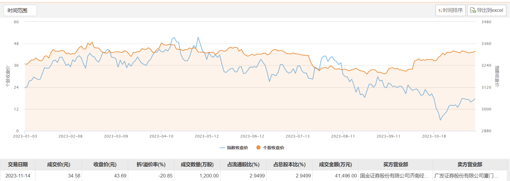 今日大宗交易成交1200万股,成交额4.15亿元,占当日总成交额的88.12%,成交价34.58元,较市场收盘价折价20.85%。