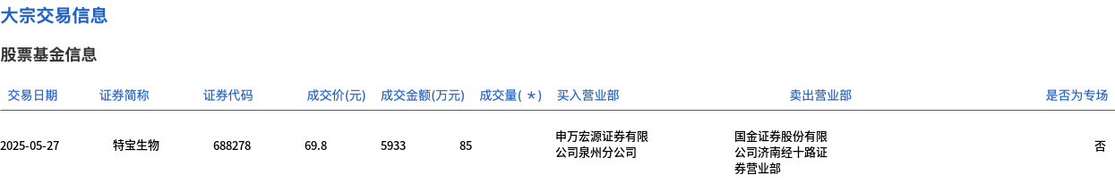 特宝生物今日大宗交易折价成交85万股,成交额5933万元