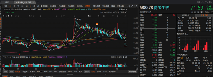 市场对这份成绩单并不满意。10月23日开盘后,特宝生物股价直接跳空低开4个点以上,盘中最大跌幅8.41%,收盘下跌6.07%,股价报72.62元/股,市值296亿元。接下来的10月23日,特宝生物股价盘中一度下跌超2%。