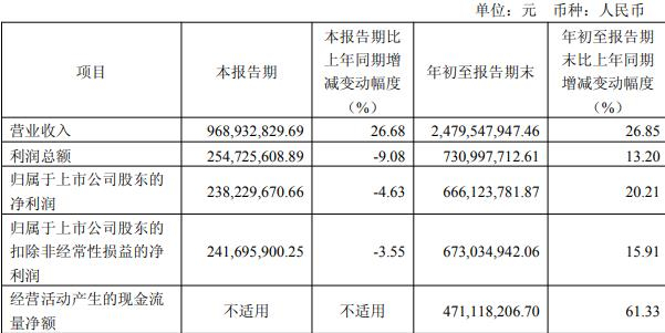 据公司2025年第三季度报告,本报告期,公司实现营业收入9.69亿元,同比增长26.68%;归属于上市公司股东的净利润2.38亿元,同比减少4.63%;扣除非经常性损益后的净利润2.42亿元,同比减少3.55%。年初至报告期末,公司实现营业收入24.80亿元,同比增长26.85%;归属于上市公司股东的净利润6.66亿元,同比增长20.21%;扣除非经常性损益后的净利润6.73亿元,同比增长15.91%;经营活动产生的现金流量净额4.71亿元。