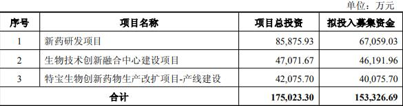 本次发行可转债募集资金总额(含发行费用)不超过人民币153,326.69万元(含本数),扣除发行费用后的募集资金净额将用于新药研发项目、生物技术创新融合中心建设项目、特宝生物创新药物生产改扩项目-产线建设。