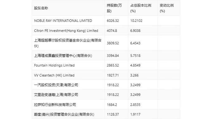 年报显示,2023年年末公司十大流通股东中,持股最多的为NOBLE RAY INTERNATIONAL LIMITED,占比10.21%。十大流通股东名单相比2023年三季报维持不变。在具体持股比例上,VV Cleantech (HK) Limited持股有所下降。