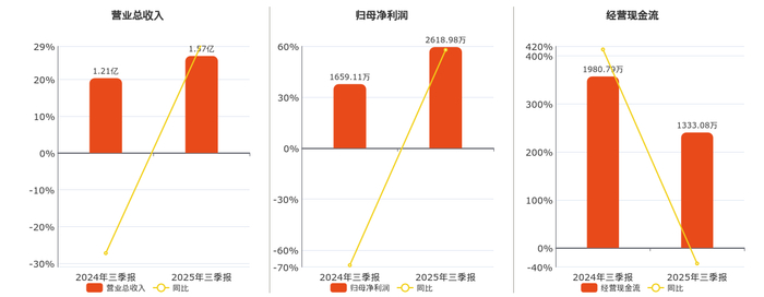 公司营业总收入为1.57亿元,在已披露的同业公司中排名第56。归母净利润为2618.98万元,在已披露的同业公司中排名第31。经营活动现金净流入为1333.08万元,在已披露的同业公司中排名第35,较去年同报告期经营活动现金净流入减少647.71万元,同比较去年同期下降32.70%。