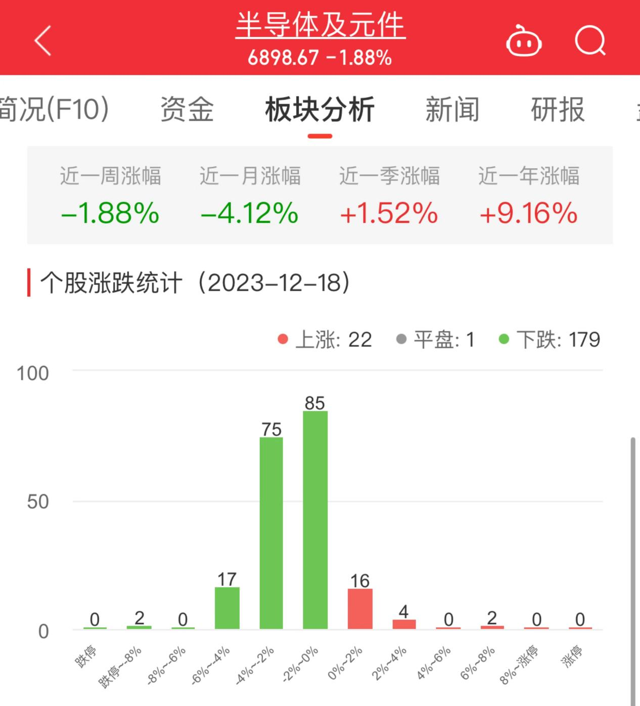 中国经济网北京12月18日讯 今日,半导体及元件板块整体跌幅1.88%,其中22只股票上涨,1只股票平盘,179只股票下跌。