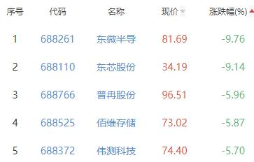 东微半导、东芯股份、普冉股份、佰维存储、伟测科技位列涨幅榜后五位,涨幅分别为-9.76%、-9.14%、-5.96%、-5.87%、-5.70%。