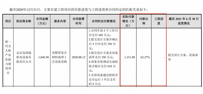 图 / 观典防务2022年回复上交所问询函资料与世恒普惠签署合同次月(2020年8月),观典防务与岚琪源签署高精度复合材料成型工艺设备采购合同,金额1848.50万元。截至2020年12月31日,公司已经付款了62.27%,即1151万元,但工程进度并未开始。