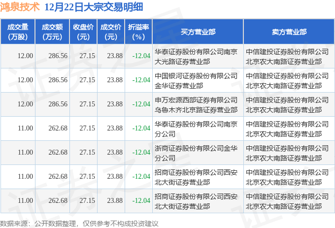 12月22日鸿泉技术现7笔折价12.04%的大宗交易 合计成交1910.4万元