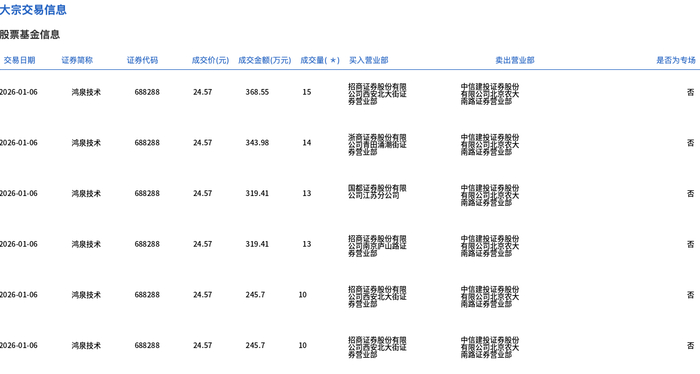 1月6日,鸿泉技术大宗交易成交75万股,成交额1842.75万元,占当日总成交额的19.35%,成交价24.57元,较市场收盘价28.13元折价12.66%。