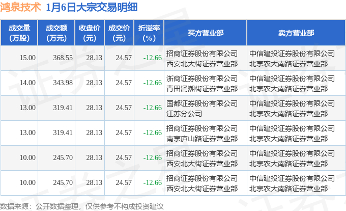 1月6日鸿泉技术现6笔折价12.66%的大宗交易 合计成交1842.75万元