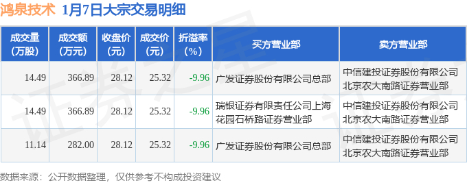 证券之星消息,1月7日鸿泉技术发生大宗交易,交易数据如下: