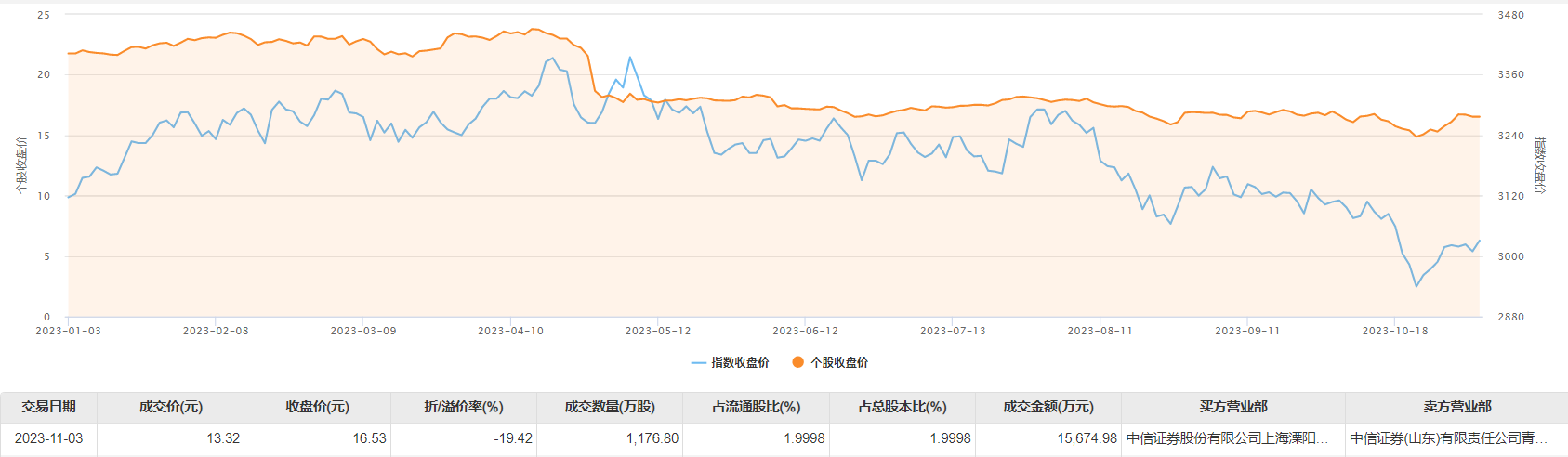 11月3日大宗交易成交1176.8万股,成交额1.57亿元,占当日总成交额的79.6%,成交价13.32元,较市场收盘价折价19.42%。