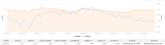 8月23日大宗交易成交202万股,成交额2989.6万元,占当日总成交额的41.95%,成交价14.8元,较市场收盘价18.28元折价19.04%。