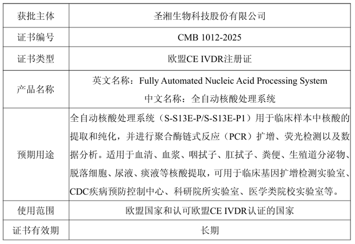 12月11日,圣湘生物(688289)发布公告,近日公司全自动核酸处理系统(S-S13E-P/S-S13E-P1)获得欧盟CE IVDR认证,证书编号为CMB 1012-2025,有效期为长期。