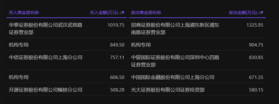 具体来看,机构买入1456.0万元,卖出904.75万元,合计净买入551.25万元。此外,华泰证券武汉武珞路证券营业部、中信证券上海分公司分别买入1019.75万元、757.11万元;招商证券上海浦东新区浦东南路证券营业部、中银国际证券深圳中心四路证券营业部分别卖出1325.95万元、830.85万元。
