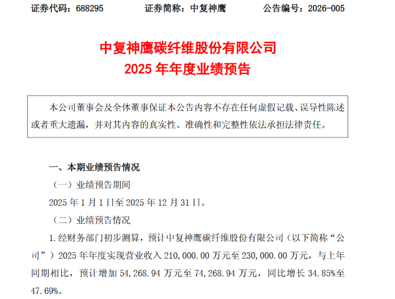 航空航天、风电等领域收入增长 中复神鹰预计2025年净利至高1.2亿元 同比扭亏