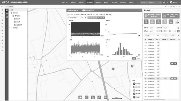 渗漏预警平台以“一张图、一报表、一流程、一统计”为理念,结合水务公司的管理模式,实现“地图+数据+业务”的一体化管理和可视化展现,是一套集展示、管理、分析、决策于一体的综合性漏控管控平台。主要用于城市输水管道的漏水检测,通过将噪声监测终端吸附在阀门、消防栓或管道上,采用振动或水音传感器采集管道噪声,运用渗漏检测算法识别管道漏损,快速对管道漏水进行检测、告警,及时有效的对漏水区域进行圈定,辅助水司检漏工作,提升检漏效率,降低物理漏失,降低供水管网漏损率。