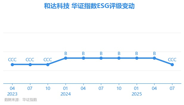 日前,华证指数公布了新一期(2025年7月31日)的ESG评级结果,和达科技(688296.SH)获得CCC评级(华证指数评级为C起至AAA九档,C为最低档,AAA为其最高一级评级/AA为其第二档),上一期(2025年4月30日)ESG评级为B。本期ESG评级在143家信息技术服务行业A股上市公司中排名第118(上一期排名第104)。