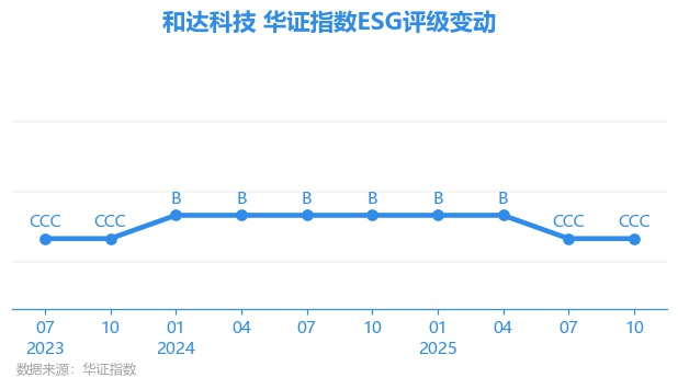 日前,华证指数公布了新一期(2025年10月31日)的ESG评级结果,和达科技(688296.SH)获得CCC评级(华证指数评级为C起至AAA九档,C为最低档,AAA为其最高一级评级/AA为其第二档),上一期(2025年7月31日)ESG评级为CCC。本期ESG评级在155家信息技术服务行业A股上市公司中排名第122(上一期排名第118)。